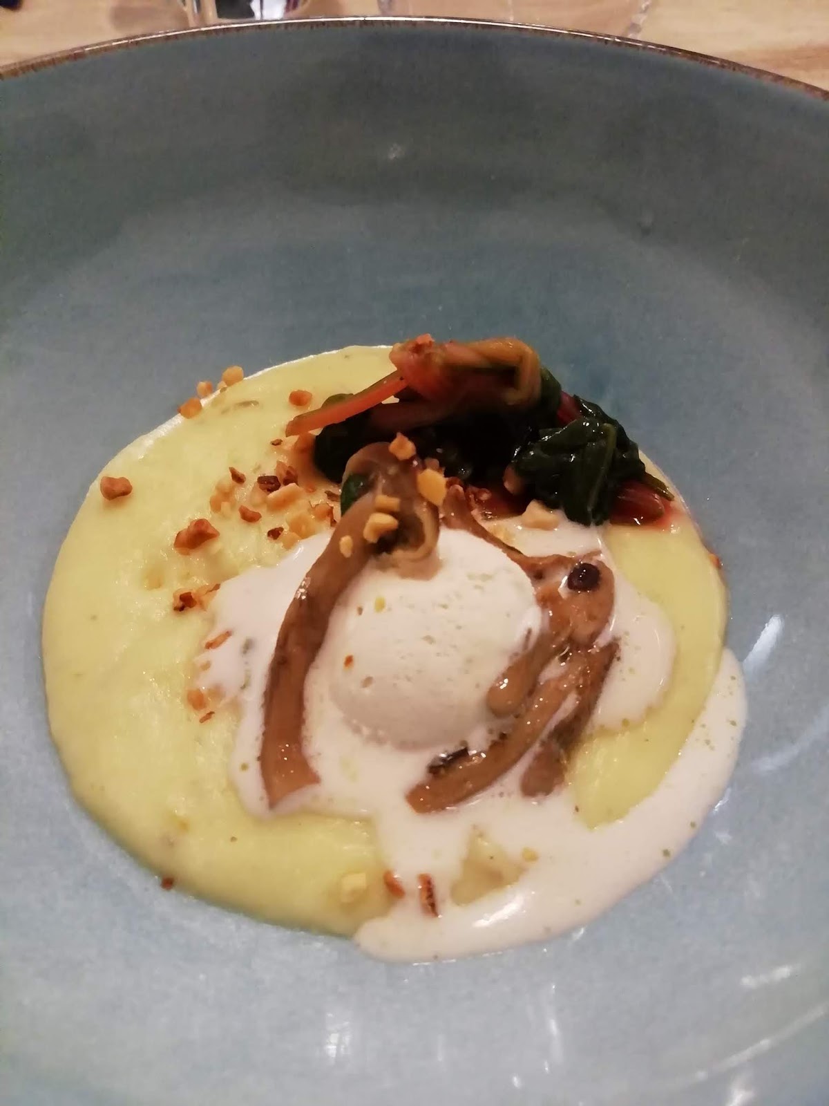crema di patate, bieta e funghi con gelato alla nocciola romana,